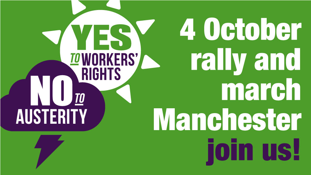 As the Conservative Party Conference meets in Manchester this year, thousands of trade union members and supporters will march through the city, taking a clear message to the party about its government’s damaging programme of austerity and attacks on the rights of working people and their unions.